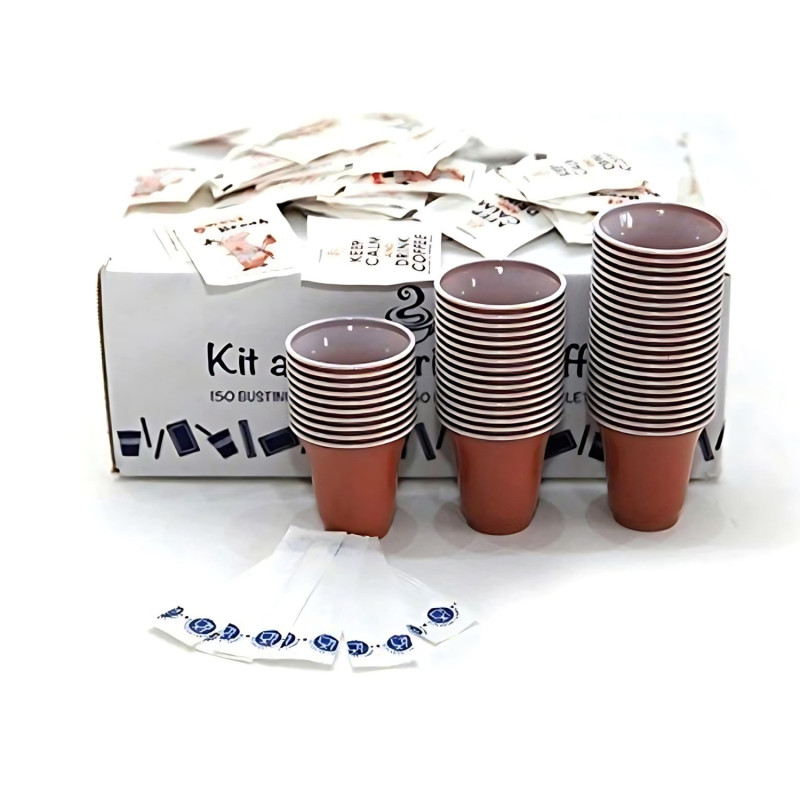 Confezione Kit Accessori per il caffè con 100 bustine di zucchero bianco, 100 bicchierini in plastica confezionati e 100 palettine sigillate singolarmente. L'ideale per casa, uffici e negozi.