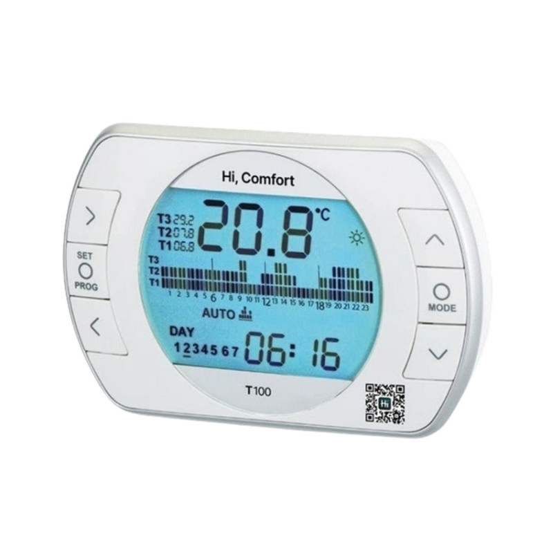 Controllo ambiente HI, COMFORT T100 destinato alla sostituzione o alle nuove istallazioni, sia con singola zona o per espansioni per applicazioni Multizona.HI, COMFORT è compatibile per il collegamento internet in abbinamento al HI, COMFORT G100-W (opzionale). La confezione include anche caricabatterie, viti, tasselli, biadesivi e manuale tecnico.