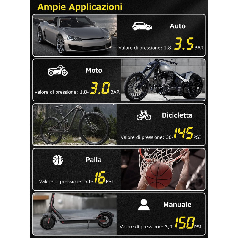 - La compressore aria auto consente di gonfiare il pneumatico in modo rapido e diretto, senza dover spendere molto per chiamare un carro attrezzi o sostituire la ruota di scorta quando la gomma dell'auto è sgonfia
