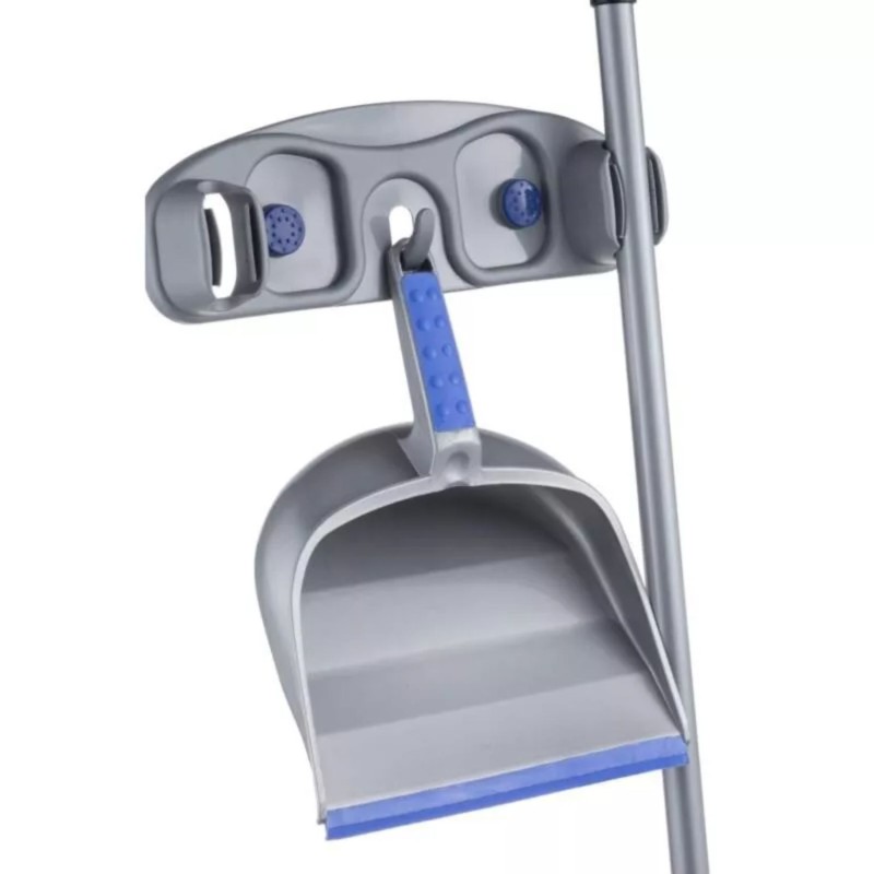 La montatura si fissa facilmente alla parete e dispone di ganci o alloggiamenti dedicati per agganciare saldamente scopa, paletta e altri utensili da pulizia, evitando che cadano o occupino spazio a terra.