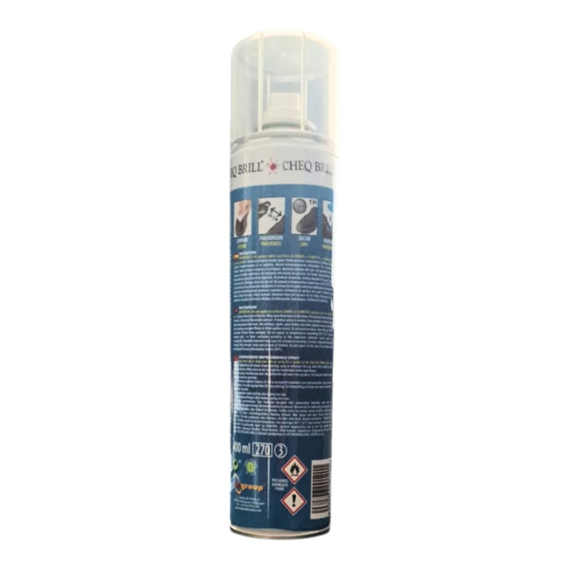 Spray protettivo e impermeabilizzante. Applicando WATERPROOF CHEQ BRILL si forma uno strato impermeabile che protegge la pelle dalle macchie causate da qualsiasi liquido. Adatto per tessuti, camoscio, crosta, nabuk e pelle in genere.