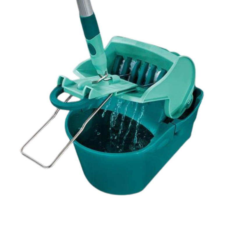 Con questo set mocio per pavimenti della Leifheit, è possibile pulire senza bagnarsi le mani o doversi chinare. È sufficiente rimuovere la testa dal telaio con il piede e posizionarla nello strizzatore, che viene ugualmente attivato senza sforzo con il piede.