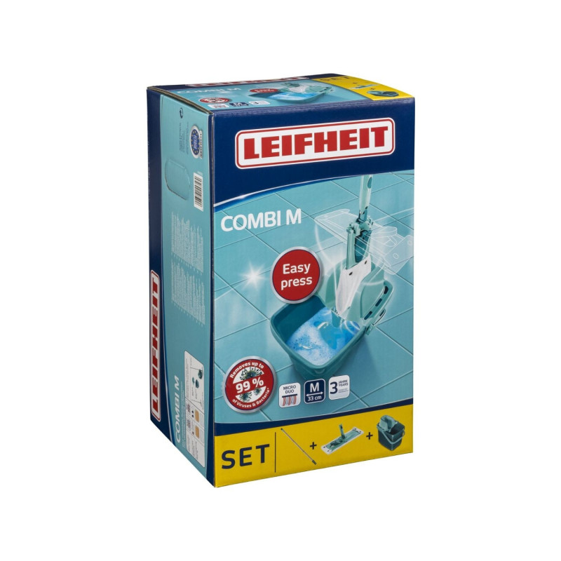 Pulire a fondo senza piegarsi e senza immergere le mani nell'acqua sporca. Il kit Combi Clean di Leifheit offre tutto il necessario per una pulizia dei pavimenti senza difficoltà: un panno per pavimenti, un secchio compatto da 12 litri ed un'applicazione Combi Press per una pratica strizzatura del panno per pavimenti. Con il suo rivestimento a 2 fibre assicura una pulizia in profondità. Le file di finissime setole leggermente sporgenti raccolgono lo sporco da tutte le scabrosità e rimuovono anche le incrostazioni di sporco più ostinato senza sforzi. Dato che il rivestimento abbraccia i lati del tergisuperfici, si puliscono anche gli angoli e bordi. Una soluzione altrettanto pratica: snodo girevole flessibile e manico completamente pieghevole. In questo modo è possibile una pulizia efficace nei percorsi tortuosi e per i punti difficilmente accessibili sotto a cassettiere, armadi e letti il panno si appiattisce completamente. Per eseguire la strizzatura in modo pratico, sbloccare il panno per pavimenti con uno scatto del pedale. Disporre il rivestimento in Combi Press e strizzare il rivestimento spingendo all'indietro il panno per pavimenti. Ed il gioco è fatto. Il rivestimento si strizza senza piegarsi e le mani restano pulite. Il panno è largo 34 cm. Leifheit offre 2 anni di garanzia sul kit Combi Clean.