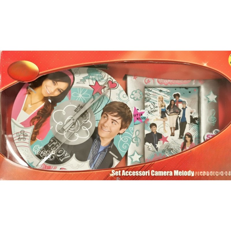Il set include un orologio a parete dal design moderno e una cornice portafoto in formato 13x18 cm, entrambi caratterizzati da un’estetica elegante con tocchi rosa, glitter e motivi teatrali.