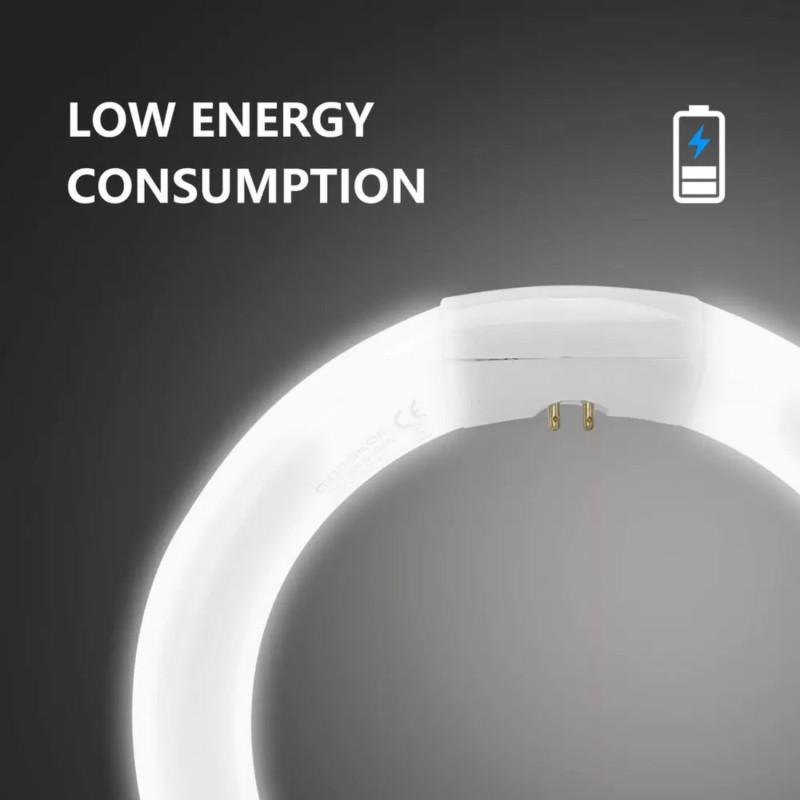 Tipo di lampada fluorescente circolare a basso consumo energetico e lunga durata, che utilizza una tecnologia a tubo circolare con un diametro di 30 cm. Viene utilizzata principalmente in ambienti interni, come uffici, negozi, magazzini, scuole e altri ambienti commerciali. Grazie alla sua forma circolare, può fornire una luce uniforme e omogenea su un’ampia area, il che la rende ideale per illuminare grandi spazi interni. Questo modello emette una potenza da 32 Watt con un flusso luminoso pari a 2100 lumen. La temperatura colore della luce è fredda, quindi tendente al blu.