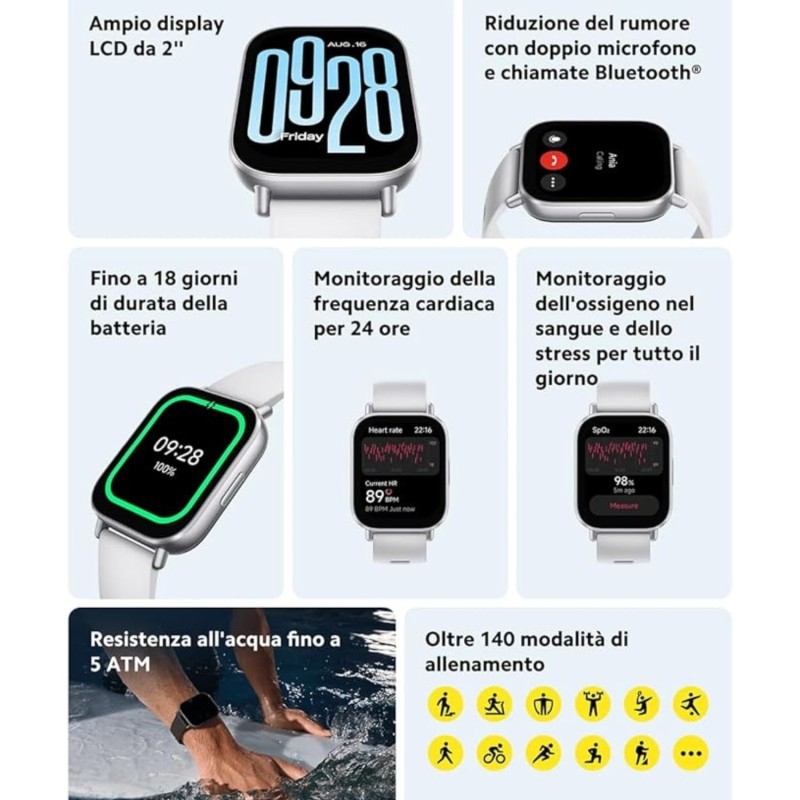 Lo XIAOMI Redmi Watch 5 Active unisce stile e funzionalità per offrirti un'esperienza completa. Con le sue numerose funzionalità di monitoraggio della salute e un'interfaccia semplice, è perfetto per chi cerca uno smartwatch versatile. Caratteristiche principali Display LCD da 2 pollici: Schermo ampio e luminoso, con risoluzione di 320 x 385 pixel, per visualizzare chiaramente le notifiche e le app. Monitoraggio della salute: Tiene sotto controllo la frequenza cardiaca 24/7, i livelli di ossigeno nel sangue (SpO2), il sonno e lo stress, aiutandoti a restare al top della forma. Autonomia eccezionale: La batteria da 470 mAh garantisce fino a 18 giorni di utilizzo tipico con una sola carica. Resistenza all’acqua 5ATM: Ideale per il nuoto e resistente fino a 50 metri di profondità, per accompagnarti anche nelle tue avventure acquatiche. Bluetooth 5.3 con chiamate integrate: Grazie al microfono e agli altoparlanti integrati, puoi gestire le chiamate direttamente dal polso, senza estrarre il telefono. Oltre 140 modalità sportive: Monitora una vasta gamma di attività sportive, con rilevamento automatico di sei attività principali come corsa e camminata. Ampia personalizzazione: Scegli tra più di 200 quadranti diversi per adattare l’orologio al tuo stile. Compatibile con dispositivi Android (8.0 e successivi) e iOS (12.0 e successivi), lo XIAOMI Redmi Watch 5 Active è il tuo alleato ideale per uno stile di vita sano e connesso.