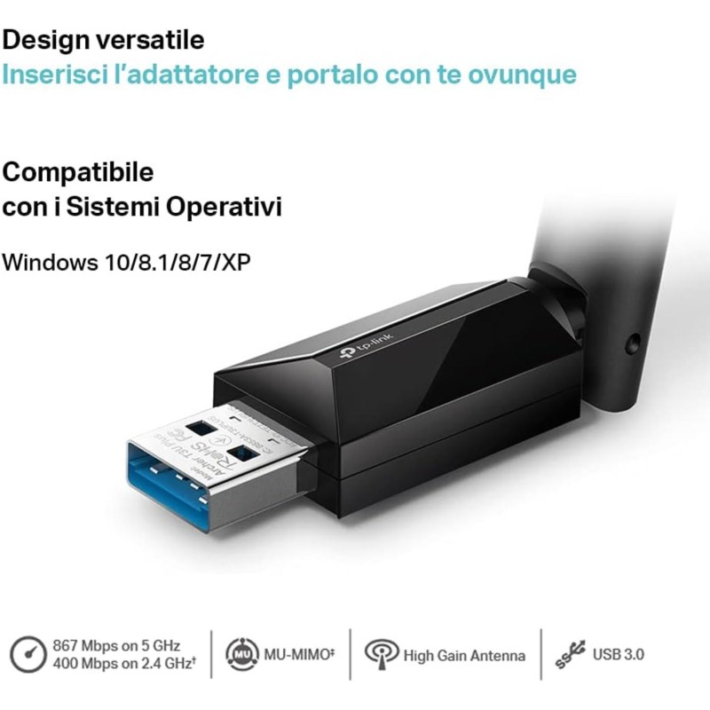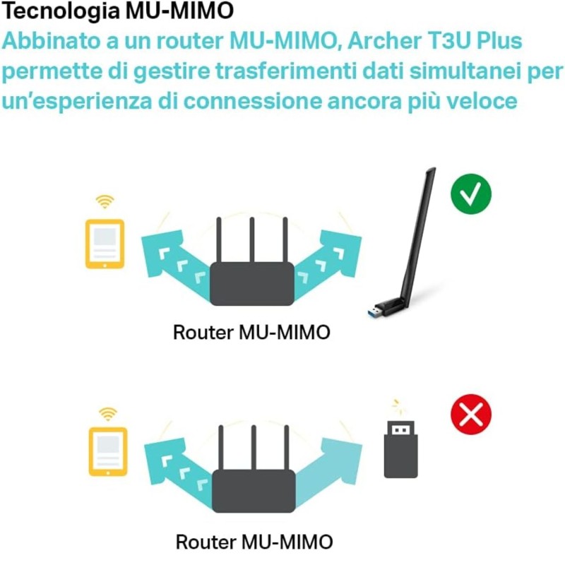 Wi-Fi Dual Band AC1300 - Per una velocità wireless fino a 867Mbps in 5GHz e 400Mbps in 2.4Ghz Tecnologia MU-MIMO - Per connessioni simultanee ultra rapide. Antenne ad alto guadagno - Doppia antenna esterna ad alto guadagno per aumentare la ricezione del segnale Compatibilità - Compatibile con Windows 11*/10/8.1/8/7/XP e Mac OS X