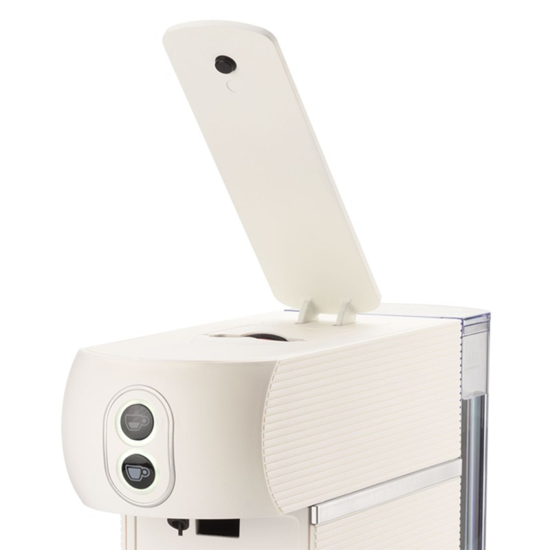 I due tasti erogazione permettono di scegliere tra caffè espresso e caffè lungo. L’esperienza di utilizzo risulta facile e intuitiva: la cialda viene inserita dall’alto ed espulsa all’interno del cassetto raccogli cialde. La forma compatta ne massimizza la praticità.