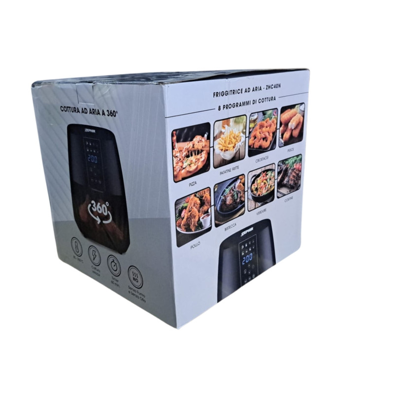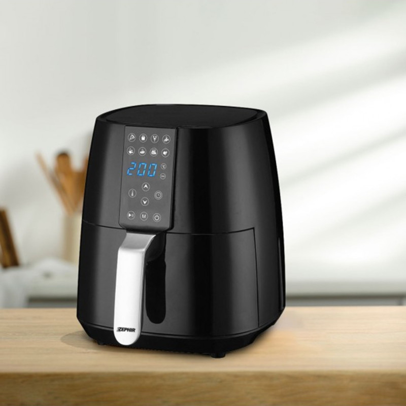 Con la nuova friggitrice ad aria Zephir puoi dire addio a fritture unte e caloriche, potrai cucinare con l'80% dei grassi in meno senza rinunciare al piacere di una frittura leggera e croccante. Grazie alla tecnologia di circolazione dell'aria calda all'interno del cestello si ottiene una cottura senza eccesso di grassi rispetto a quella delle friggitrici tradizionali con il vantaggio di gustare del cibo delizioso riducendo i tempi di cottura e l'odore. 8 programmi di cottura preimpostati (pizza, patatine fritte, crostacei, pesce, pollo, bistecca, costine e verdure), selezionabili tramite il display LED con un semplice tocco. E' inoltre dotata di timer fino a 60 minuti. Sarà sufficiente inserire il cibo nel cestello estraibile ed impostare i parametri di cottura. I residui si posizioneranno sul fondo, garantendo non solo la possibilità di gustare il cibo comodamente seduti tra una sessione di cottura e un'altra, ma anche una rapida operazione di pulizia. Il cestello ed il vassoio sono smontabili e lavabili separatamente.