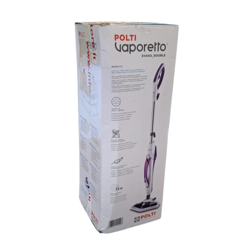 Polti Vaporetto SV440_Double unisce in un unico apparecchio la doppia funzione: scopa vapore e pulitore portatile per trattare fino a 15 diverse superfici. Leggera e maneggevole, uccide e rimuove il 99,9% di germi e batteri*. Diffonde un fresco profumo in tutta la casa perché è dotata di un dispenser per l'erogazione dell'esclusivo deodorante Frescovapor.