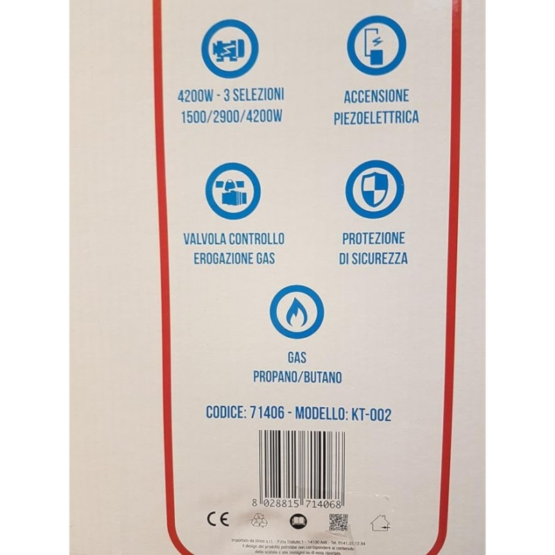 La stufa a gas vinco 71406 ha una potenza di 4200 watt, selezionabili in base alle esigenze in 3 selezioni riscaldanti (1400-2800-4200 watt). Possiede l'accensione piezo elettrica, oltre al dispositivo di sicurezza di spegnimento fiamma, ed il dispositivo anti ribaltamento. Alimentazione gas propano/butano, pannello a infrarossi.