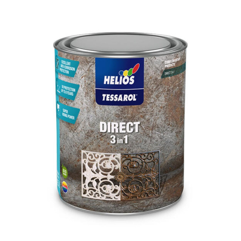 TESSAROL DIRECT 3in1 è una finitura anticorrosiva per la decorazione e la protezione delle superfici in ferro e acciaio. Può essere applicata direttamente su superfici asciutte e carteggiate, ripulite da particelle di ruggine. Grazie alle sue eccellenti proprietà anticorrosive può essere applicata direttamente sulla superficie senza l’applicazione di un primer. Forma una finitura lucida sulla superficie verniciata, proteggendo la superficie dalla ruggine.