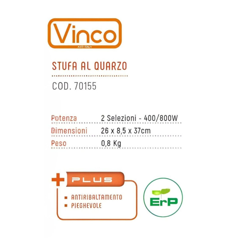 Stufa al quarzo Vinco da appoggio. La stufa al quarzo garantisce consumi inferiori rispetto alle tradizionali stufe con resistenza elettrica, fornendo riscaldamento direttamente agli oggetti o persone posti in prossimità, anzichè all’aria circostante. Con sicurezza antiribaltamento. Con 2 selezioni di potenza da 400W a 800W. Pieghevole e molto compatta. Realizzata in plastica antiurto di colore antracite. Utilizzo: appoggio su pavimento o superfici rialzate in abitazioni o uffici.