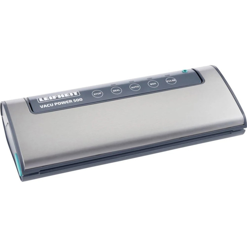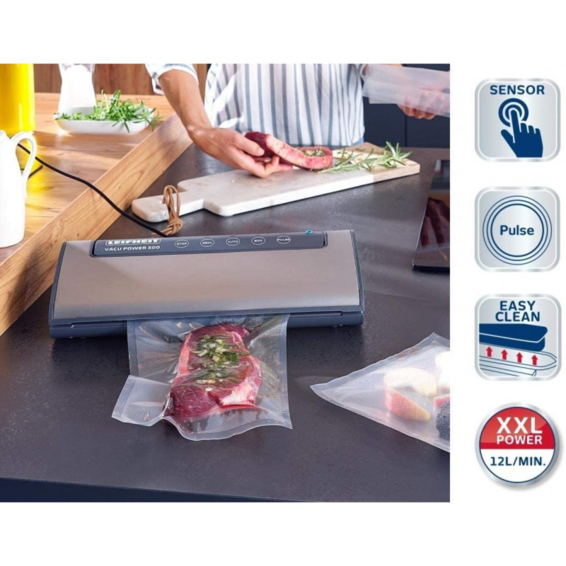 La macchina per sottovuoto Vacu Power 500 di Leifheit è la soluzione ottima per coloro che desiderano conservare i propri alimenti fino a cinque volte più a lungo. Infatti dispone di una potenza d'aspirazione efficiente con una prestazione di dodici litri al minuto. In questo modo si possono mettere velocemente sottovuoto frutta, verdura, carne, ecc. Il display Sensor-Touch acustico è intuitivo e facile da utilizzare. All’occorrenza tramite il tasto di arresto il processo di sottovuoto può essere interrotto. Inoltre anche la potenza del sottovuoto può essere personalizzata tramite la funzione a impulsi. Il controllo elettronico della temperatura offre l’utilizzo sicuro e impedisce che le linee di sigillatura del sacchetto si fondano. Inoltre è comodo il fatto che la camera del sottovuoto sia estraibile. In questo modo può essere pulita facilmente e si pulisce igienicamente in un attimo. I contenitori possono essere messi sottovuoto grazie alla funzione integrata. I contenitori per sottovuoto e il tubo d'aspirazione sono disponibili separatamente. La doppia linea di sigillatura della macchina per sottovuoto Vacu Power 500 offre una particolare stabilità. Affinché gli alimenti rimangano freschi e chiusi ermeticamente a lungo, è molto importante la qualità dei sacchetti e delle pellicole per sottovuoto utilizzate. La dotazione comprende già dieci sacchetti per sottovuoto di Leifheit da 20 x 30 cm, molto resistenti e grazie alla loro struttura professionale offrono un risultato ottimale.